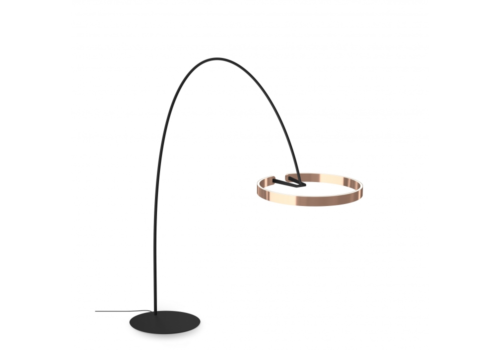Mito Largo firmata da Occhio è una lampada da terra a LED regolabile in altezza realizzata con diffusore in alluminio verniciato e rivestito in PVD e silicone ottico, corpo verniciato in carbonio e base in acciaio verniciato. Dissolvenza su e giù. Telecomando incluso.