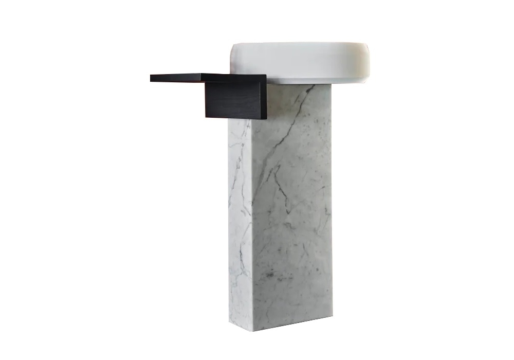 Lariana firmato da Patricia Urquiola per Agape è un lavabo a colonna realizzato con supporto in marmo Carrara, mensola portaoggetti in rovere scuro e lavabo tondo in cristalplant bianco con piletta.