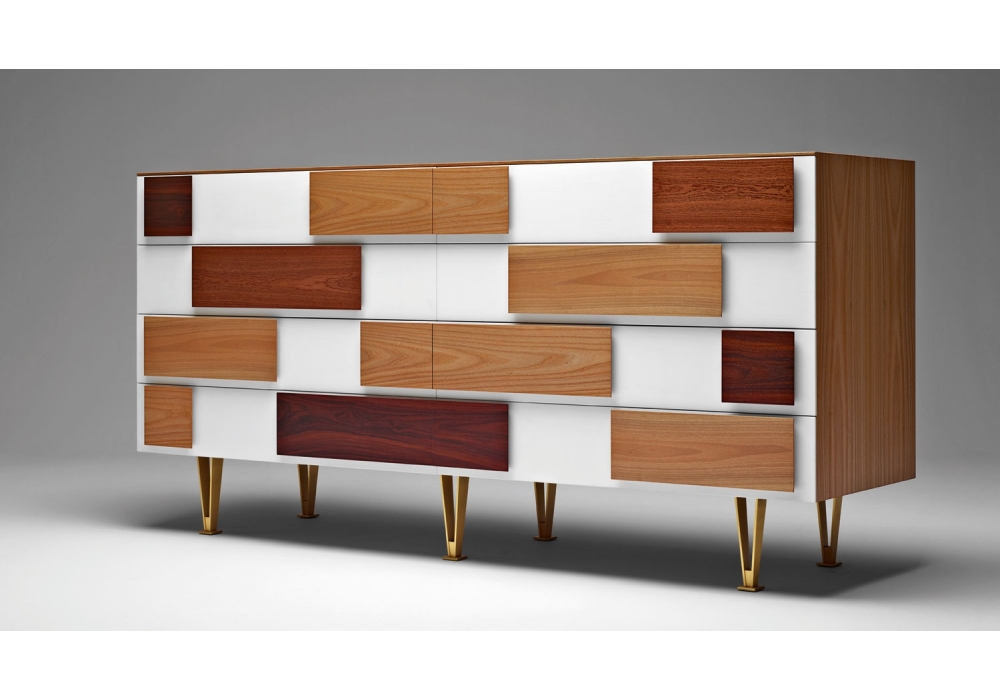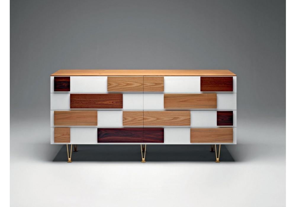 D.655.1 firmata da Gio Ponti per Molteni&C è una cassettiera caratterizzata dai frontali dei cassetti verniciati a mano in colore bianco con maniglie applicate di varie essenze (olmo, noce nazionale, mogano e palissandro). La struttura in essenza di olmo è sostenuta da piedi in ottone satinato.