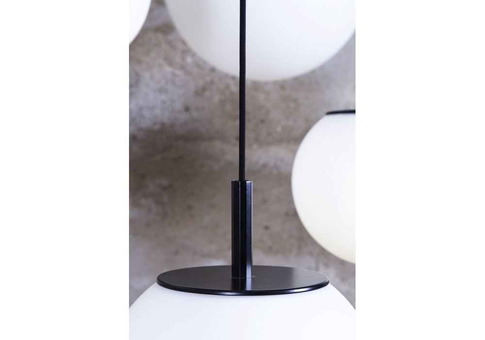 Sfera firmata da Lucie Koldová per Brokis è una lampada a sospensione con struttura in metallo verniciato nero. Paralume sferico in vetro opalino. Rosone bianco. Cavo in fibra tessile nero. Lampadina non inclusa!