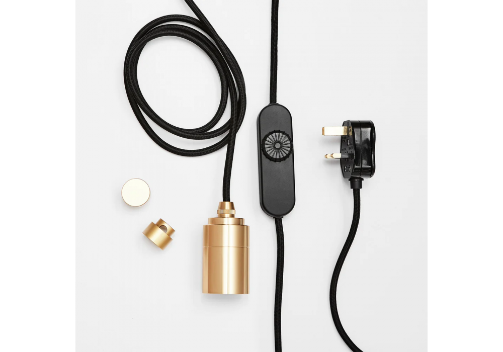 Plug-In firmata da Tala è una lampada a sospensione finitura ottone e cavo in tessuto nero.