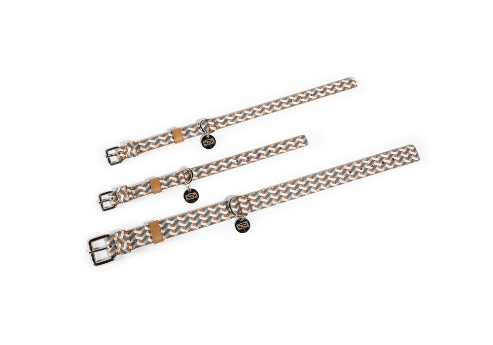 Collar disegnato da Poltrona Frau Style & Design Center è un collare realizzato in Pelle Frau® all'esterno e Pelle Frau® Motif Weavers all'interno. È dotato di rinforzo interno antistrappo, fibbie a D, anelli in ottone nichelato e targhetta in Zama zincata nichel lucido.