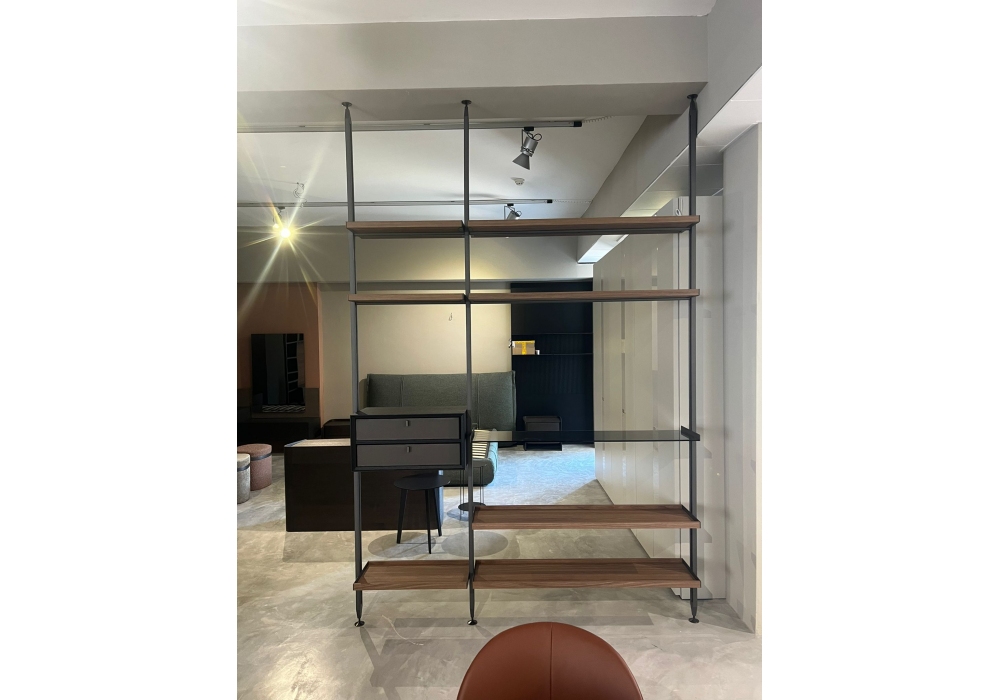 Antis firmata da Alf DaFrè è una parete attrezzata realizzata con montanti in metallo finitura Moka Shine, mensole in Nobilitato Noce Naturale e vetro trasparente grigio. Contenitore Day 12 "VAS" in legno Rovere Fossile e interno rivestito in cuoio Ghisa (1031).