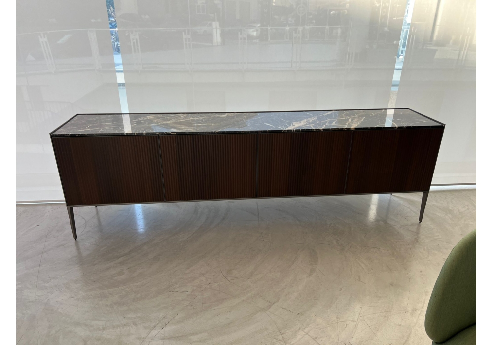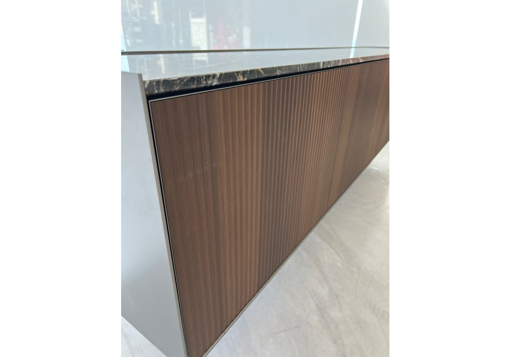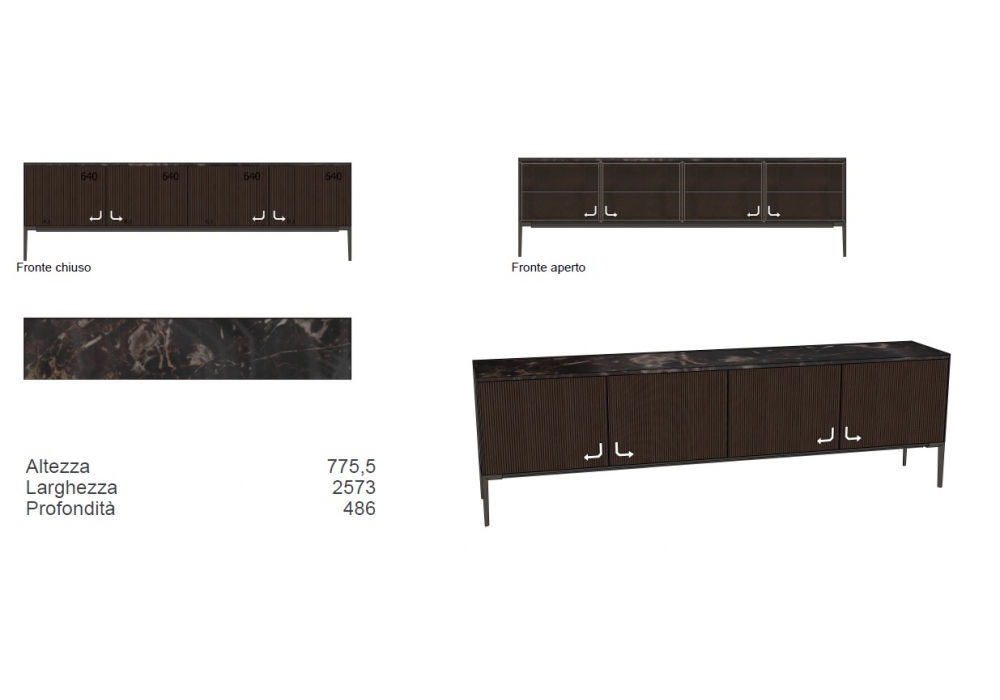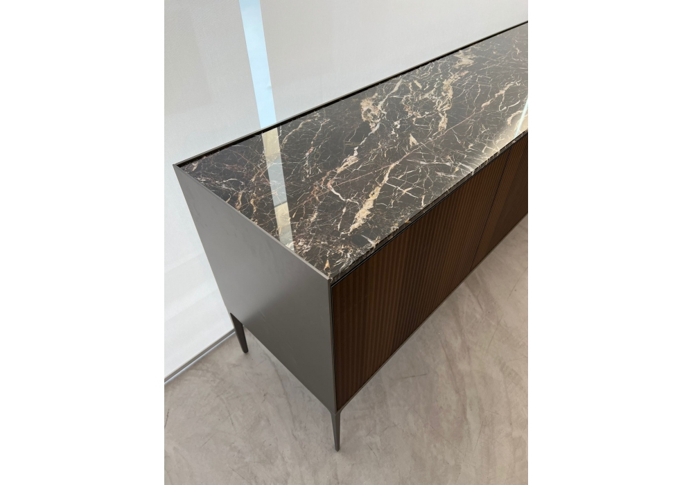 Self Bold firmata da Giuseppe Bavuso per Rimadesio è una madia realizzata con frontali in rovere termotrattato Sahara, basamento, fianchi e profili in Ecolorsystem 302 Grafite, piano in marmo Noir Saint Laurent e interni rivestiti in cuoio brown.