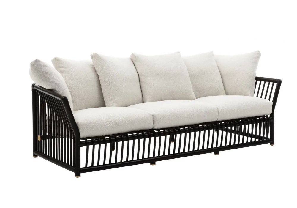 Softcage firmato da Mario Bellini per B&B Italia Outdoor è un divano per esterno realizzato con struttura in rattan tinto nero, cuscini seduta e schienale in tessuto e piedini in alluminio anodizzato effetto ottone.