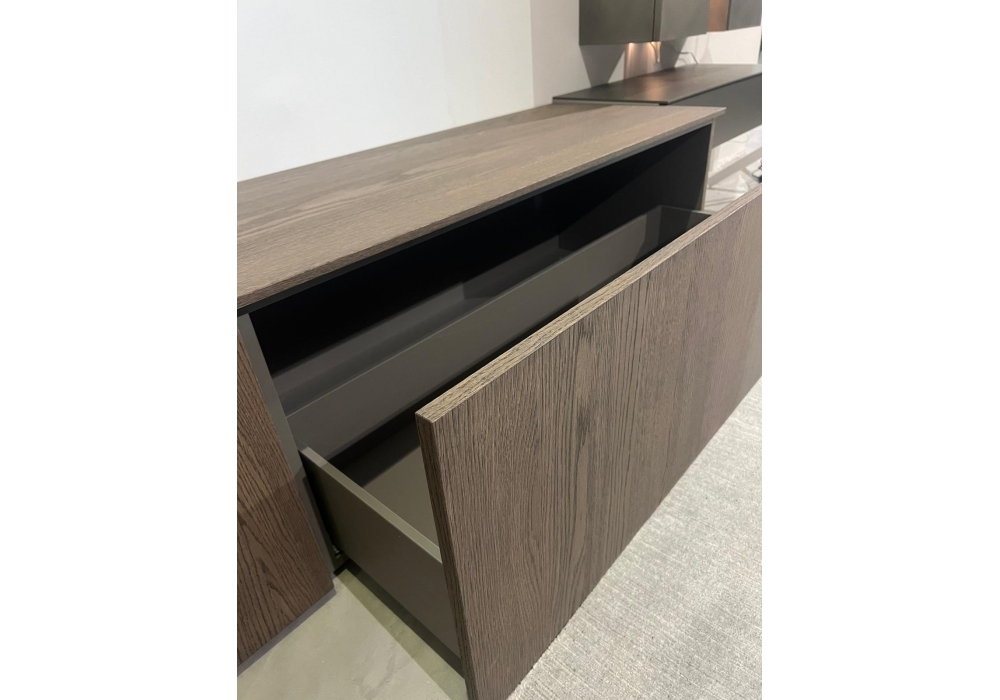MH6 firmata da Modulnova è una madia con cassetti realizzata con aperture premi apri, finitura rovere cenere spazzolato. Interni in melaminico grigio texture.