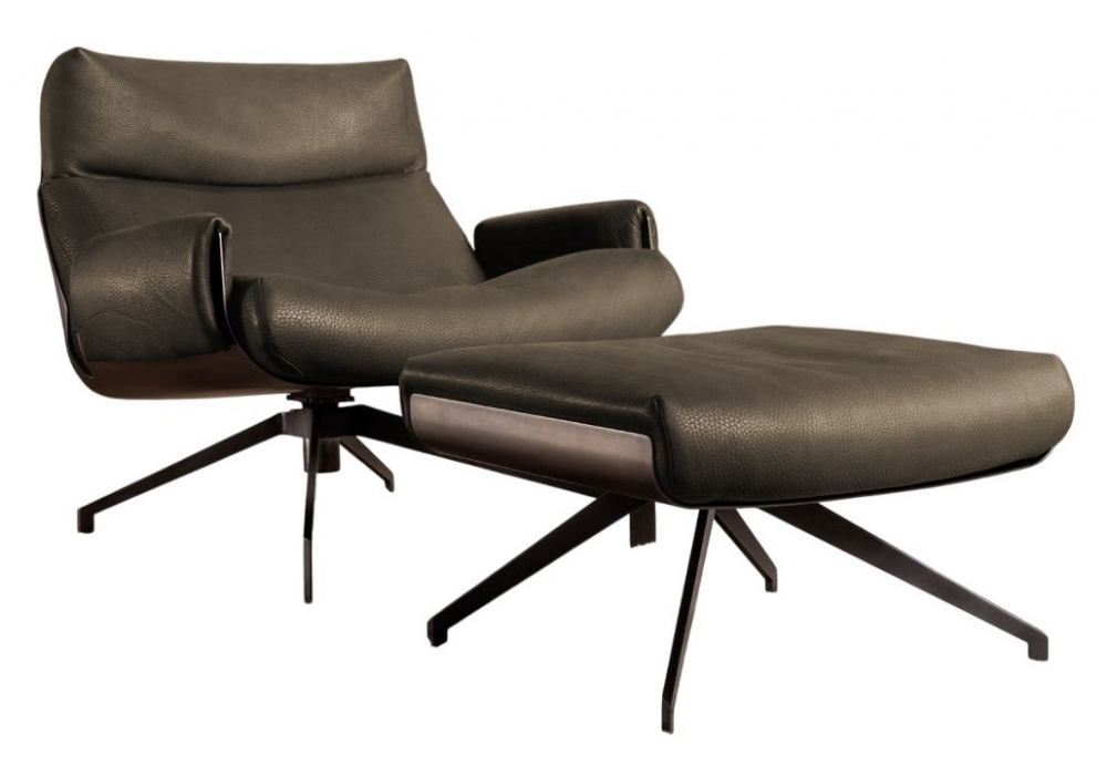 Club 57 firmata da Massimo Castagna per Henge è una poltrona con pouf realizzati con struttura in metallo acciaio brunito nero e cuscini imbottiti in poliuretano espanso con rivestimento in Camoscio - 21 Stone.