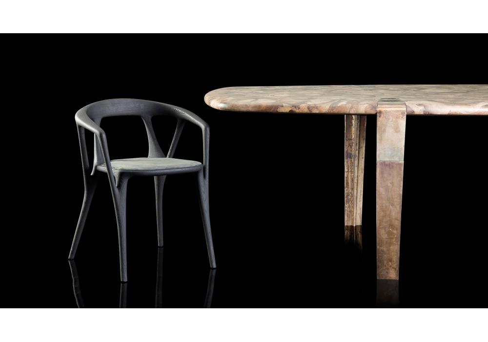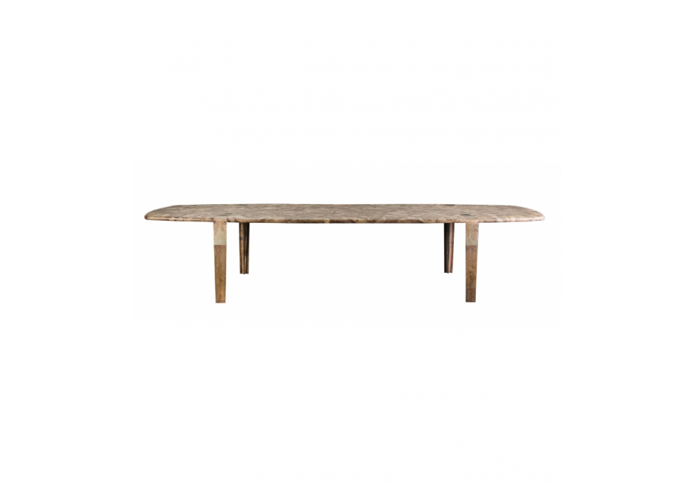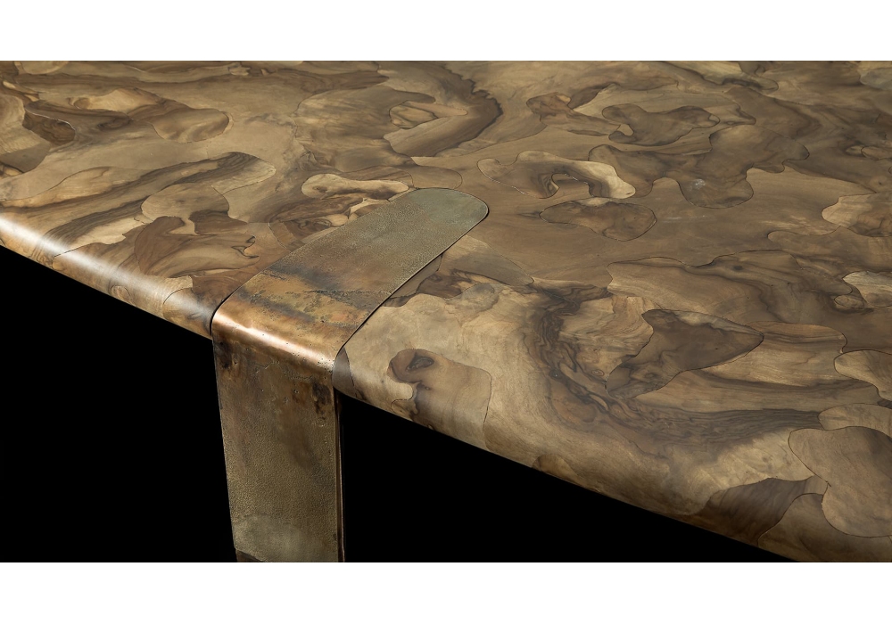 Oxymoron firmato da Massimo Castagna per Henge è un tavolo quadrangolare con angoli arrotondati e piano in legno Forest Fusion. Struttura in acciaio con gambe in fusione di sabbia, bronzo.