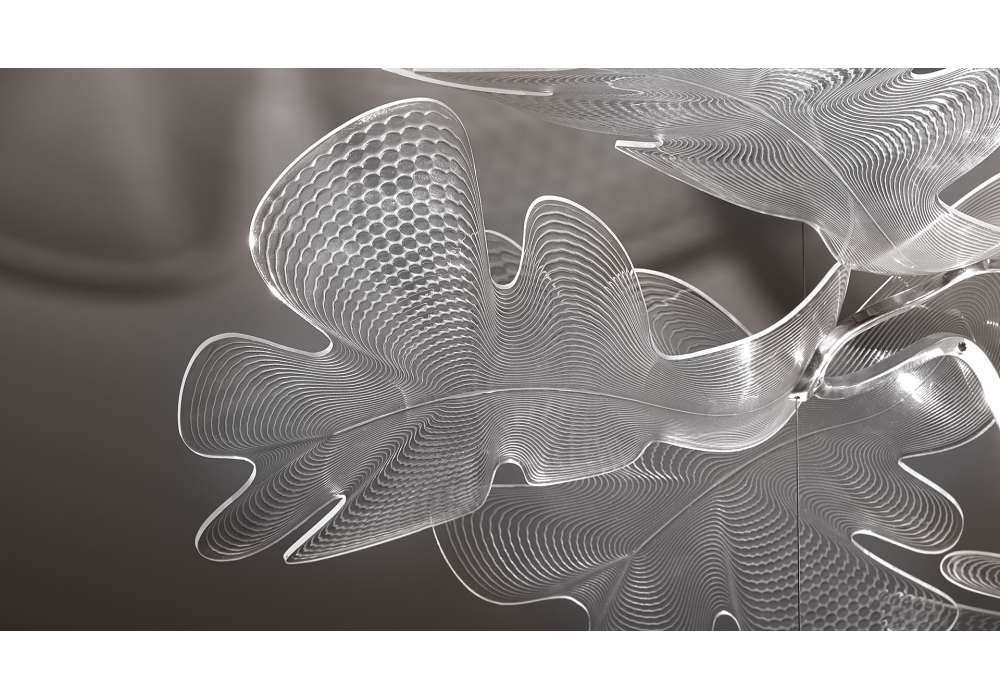 Chlorophilia firmata da Ross Lovegrove per Artemide è una lampada a sospensione con rosone e struttura portante in alluminio. La parte diffondente è strutturata a due livelli da forme astratte in metacrilato e tecnopolimero che schermano delle sorgenti luminose di tipo LED con sistema di dimmerabilità Push o remota tramite apposita App Artemide.