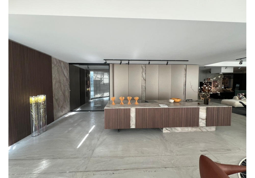 Vertical + Groove firmata da Modulnova è una cucina con ante in finitura Ivory Laccato Metal (HFV), maniglia integrata senza fori, e scocca in Milltech Lava (D98). Piedini H 1,5 cm. Cassetti e cestoni con sistema Blum “Basic Nero”. L’isola è composta dai modelli Groove Noce Raw e Blade Metalli. Groove Noce Raw presenta ante in Noce Moka (ND7), scocca in Milltech Lava (D98), apertura push-pull e accessori interni Blum “Basic Nero”. Blade Metalli è caratterizzato da ante in Alluminio Bronze Dust (ALX), scocca in Grigio Texture (MGT), piedini H 6 cm e interni Blum “Basic Grigio”. Il design essenziale e materico valorizza l’alternanza di texture e tonalità.