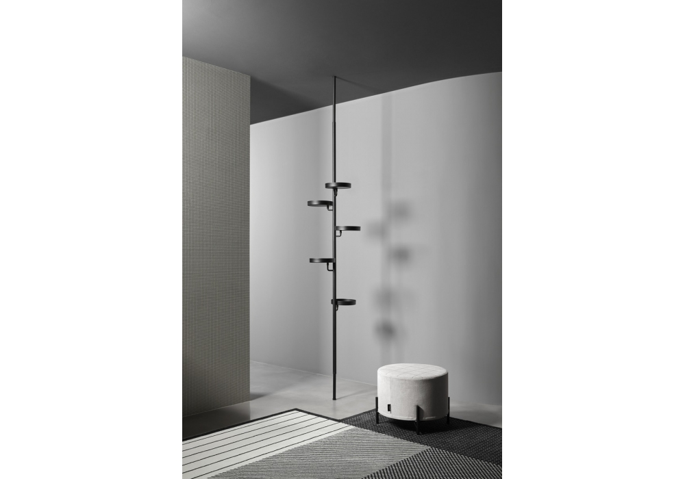 Cactus firmata da Brian Sironi per Antonio Lupi è un'asta appendiabiti terra/soffitto in acciaio verniciato nero goffrato con prolunghe terminali regolabili in altezza completo di cinque ganci portabiti e cinque contenitore svuotatasche in acciaio verniciato.