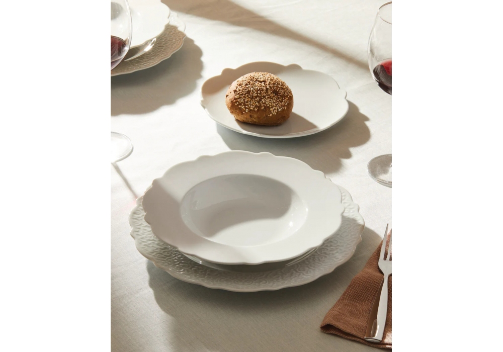 Dressed disegnato da Marcel Wanders per Alessi è un piatto fondo realizzato in porcellana bianca.