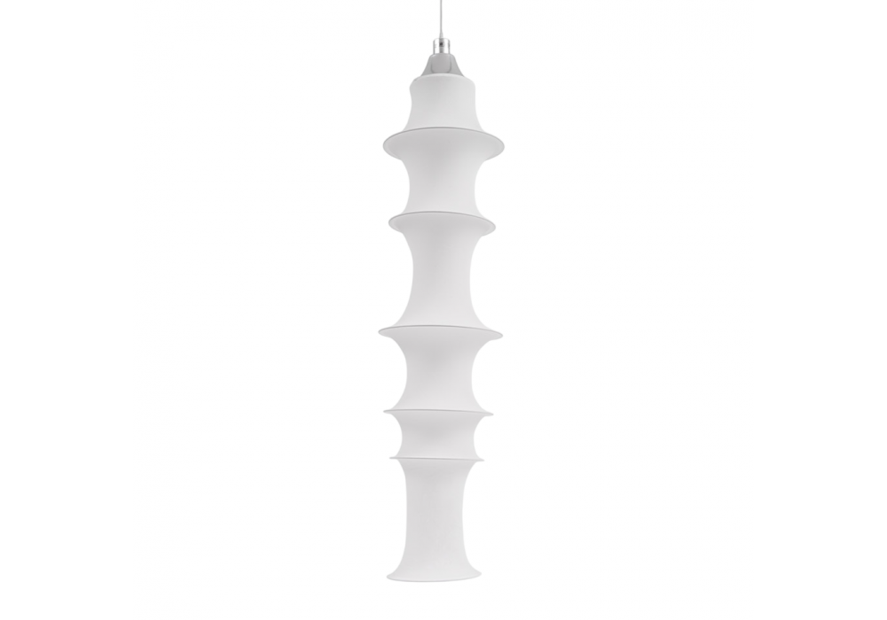 Falkland firmata da Bruno Munari per Artemide è una lampada a sospensione con struttura in alluminio naturale e diffusore in maglia elastica tubolare bianca sostenuta da cerchi concentrici in metallo. La sorgente luminosa adottata è di tipo LED con sistema di dimmerabilità.