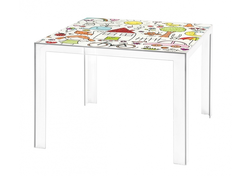 Invisible Table Kids firmato da Tokujin Yoshioka per Kartell è un tavolo realizzato con struttura in PMMA trasparente e piano con coloratissime grafiche per bambini.