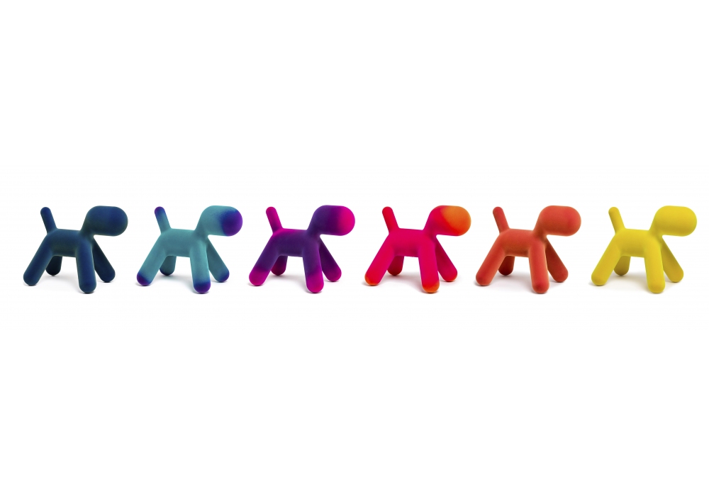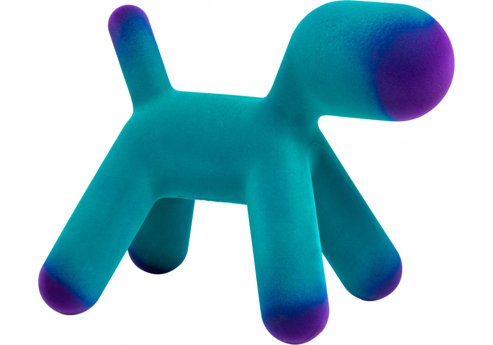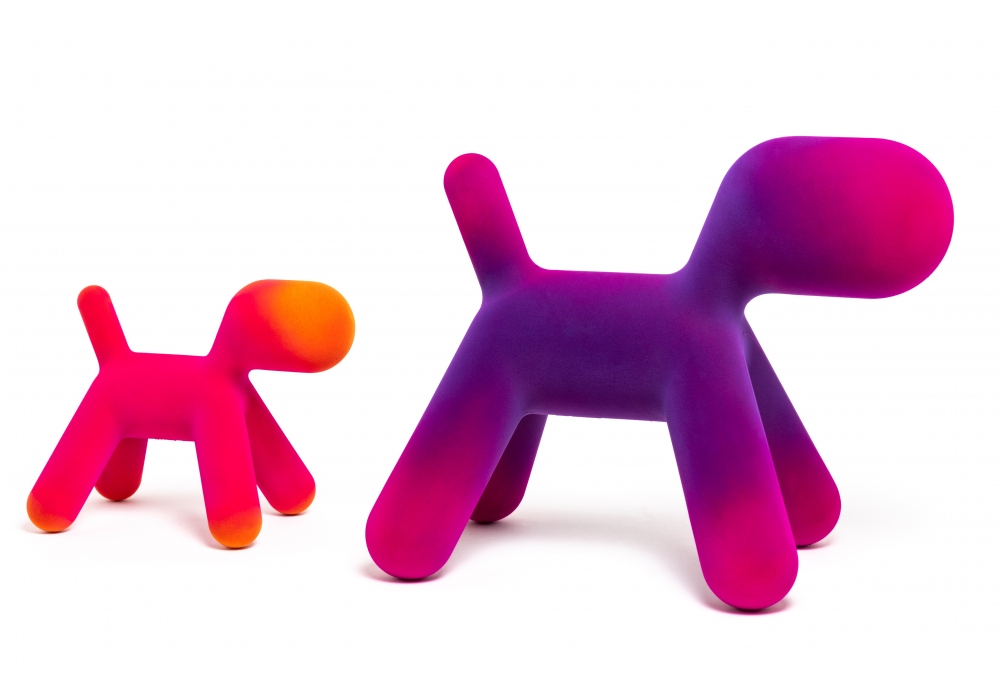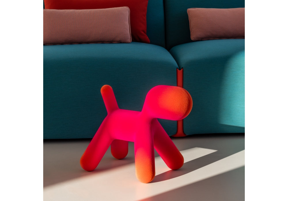 Puppy firmato da Eero Aarnio per Magis Me Too è un cane astratto realizzato in polietilene con strato superficiale in poliammide. La superficie è bicolore o monocolore effetto velluto in varie finiture.