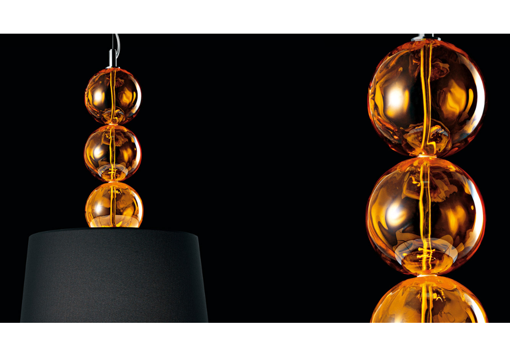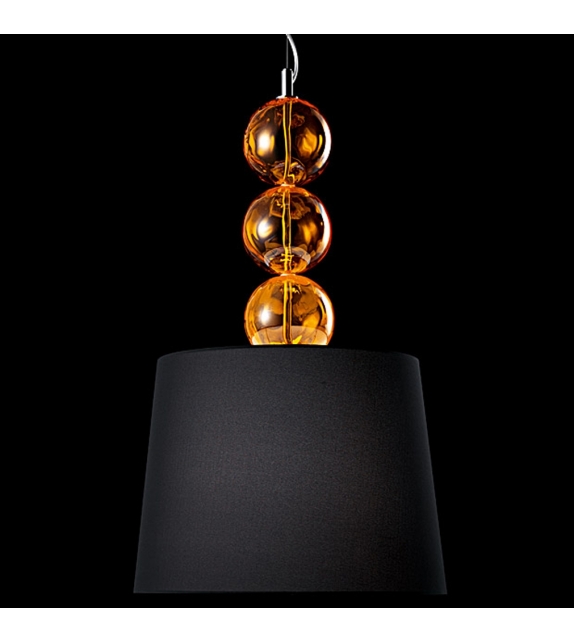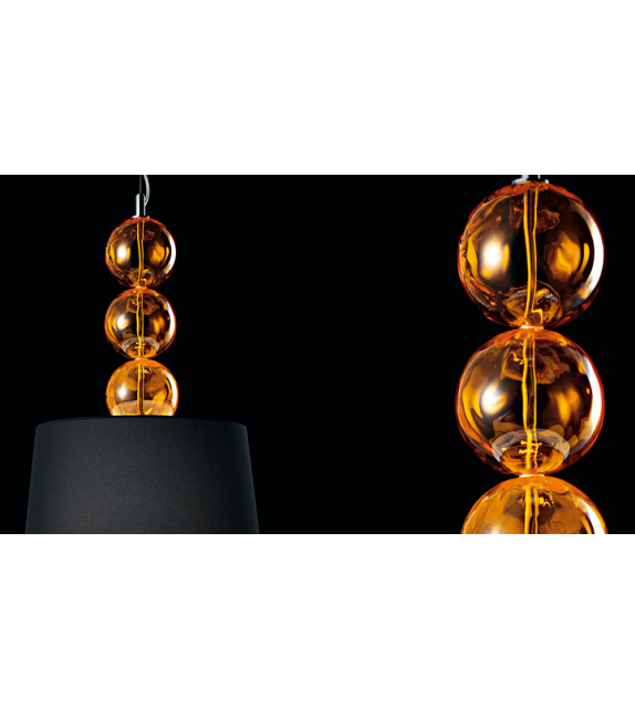 Marta firmata e prodotta da Barovier & Toso è una lampada a sospensione con struttura portante in metallo tubolare arricchito da tre sfere in vetro veneziano. Il paralume è di forma circolare in tessuto e scherma una sorgente luminosa di tipo LED o alogena dimmerabile. Marta è disponibile in differenti finiture.