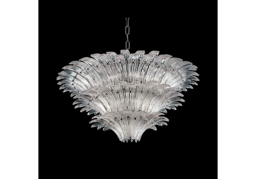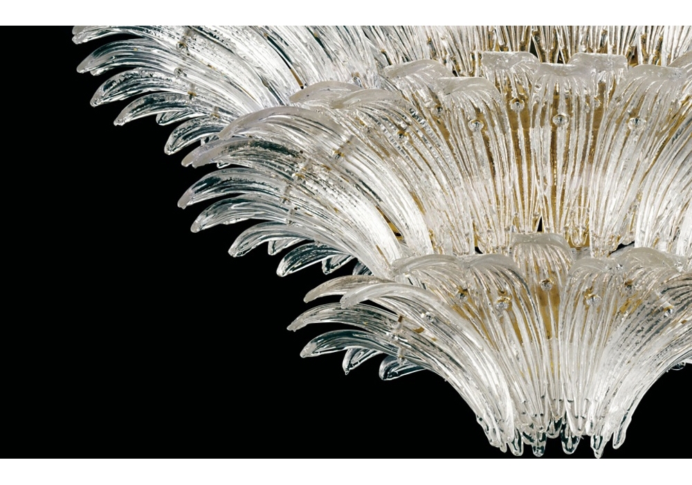 Palmette è una lampada a sospensione firmata da Barovier & Toso. La struttura portante è in metallo, adornata da diverse applicazioni in senso circolare di vetro veneziano in un unica finitura cristallo trasparente. Le parti metalliche che arricchiscono la struttura sono in due finiture oro galvanizzato o cromo lucido. Palmette è disponibile in differenti versioni e dimensioni.