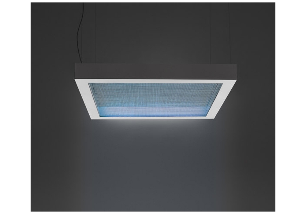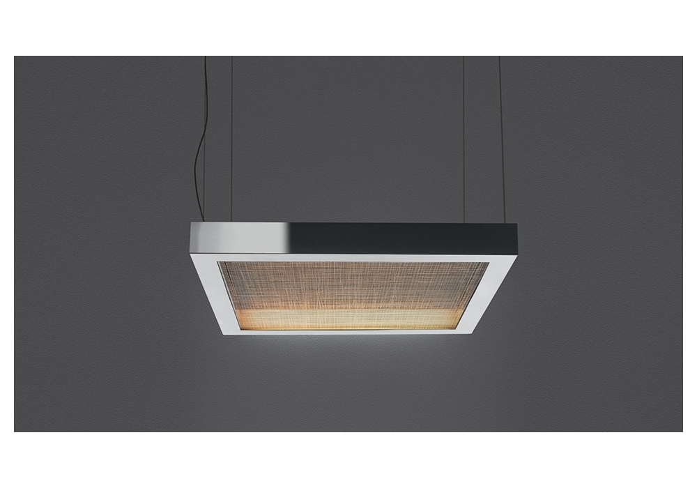 Altrove firmata da Carlotta de Bevilacqua per Artemide è una lampada a sospensione con struttura portante portante è in alluminio specchiato. I diffusori laterali sono Prismoptic satinato mentre il diffusore frontale è in metacrilato trasparente inciso. Le sorgenti luminose adottate sono di tipo LED RGB con sistema di dimmerabilita Push pilotabili anche da remoto.