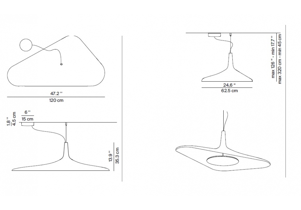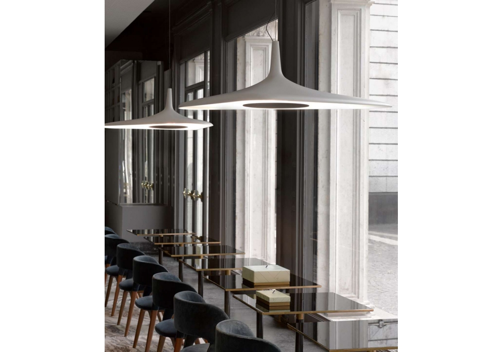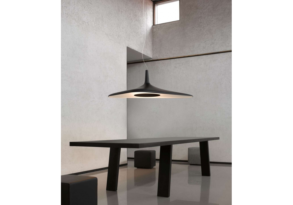 Soleil Noir firmata da Odile Decq per Luceplan è una lampada a sospensione a LED realizzata con schiuma poliuretanica stampata nella finitura biancha o nera. La lampada è sostenuta da un solo cavo asimmetrico ed estensibile.