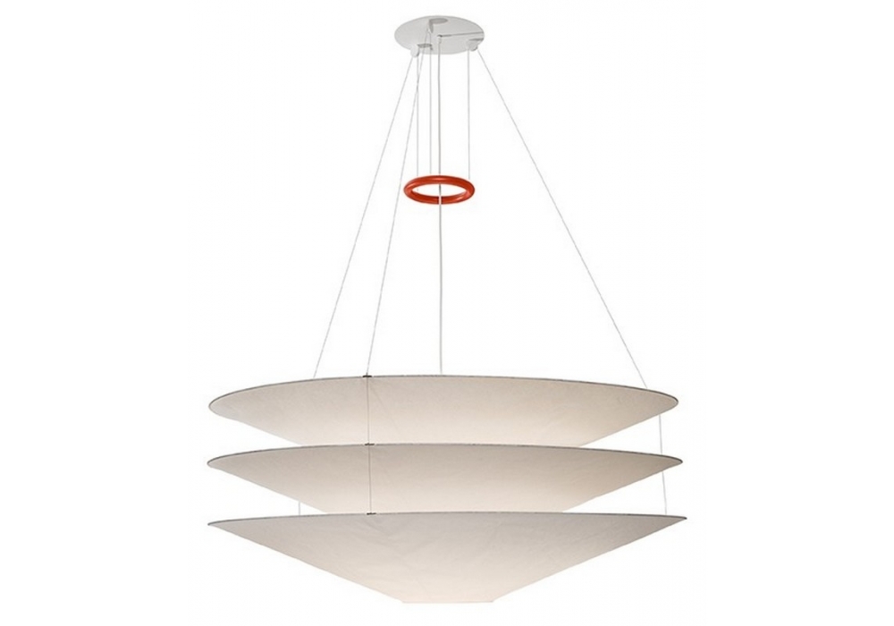 Floatation firmata e prodotta da Ingo Maurer è una lampada a sospensione con diffusore in carta giapponese, disponibile in diverse dimensioni. Anello rosso in ferro per la regolazione dell’altezza, rosone in metallo verniciato bianco.