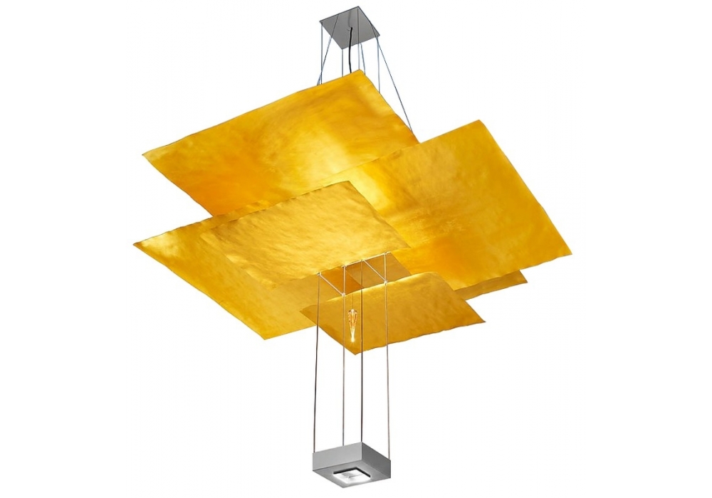 Oh Mei Ma Kabir firmata e prodotta da Ingo Maurer composta da sei fogli di carta dorata. Pendolo in plexiglas. Dimmerabile, munito di LED integrate. Lunghezza cavo disponibile in 2 dimensioni.
