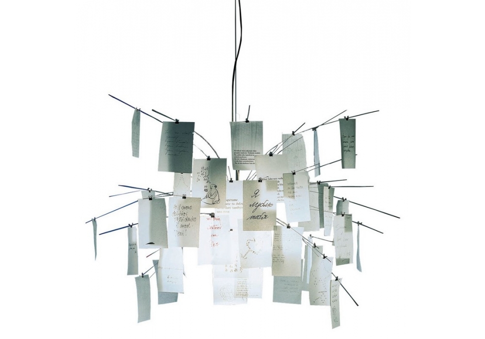 Zettel’z 5 firmata e prodotta da Ingo Maurer è una lampada a sospensione con struttura in acciaio inossidabile e vetro satinato termoresistente. Diffusore in carta giapponese: 31 fogli prestampati e 49 fogli bianchi (dimensione A5). I fogli possono essere disposti a piacere. I fogli bianchi in dotazione possono essere usati per schizzi o messaggi personali. La carta giapponese è molto sottile e traslucente. Due lampadine generano una buona luce molto piacevole.