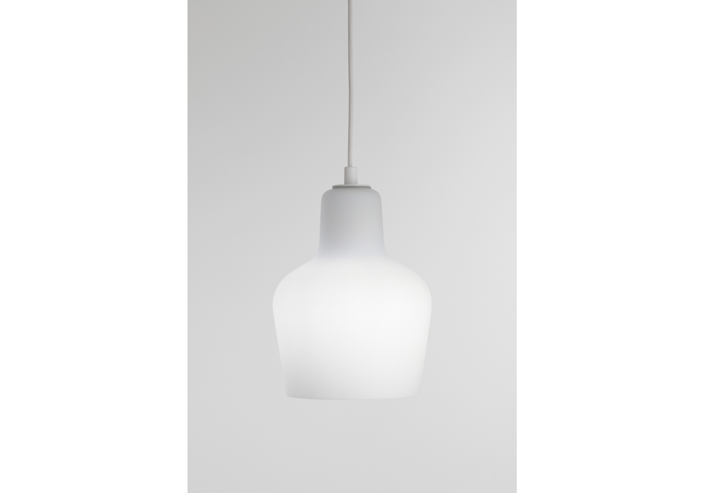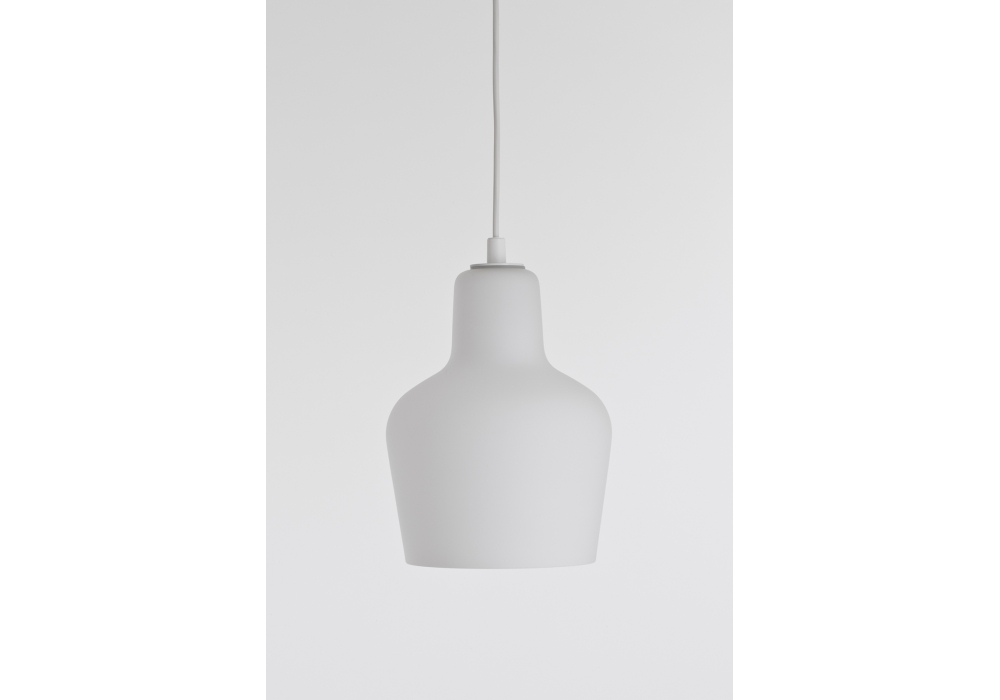 La lampada a sospensione A440 disegnata da Alvar Aalto per Artek. Questo modello gemello di Golden Bell è realizzato in vetro soffiato. La luce si disperde attraverso il vetro opale in modo uniforme, senza abbagliamento. Vetro opalino satinato acidato, finiture verniciate bianche.