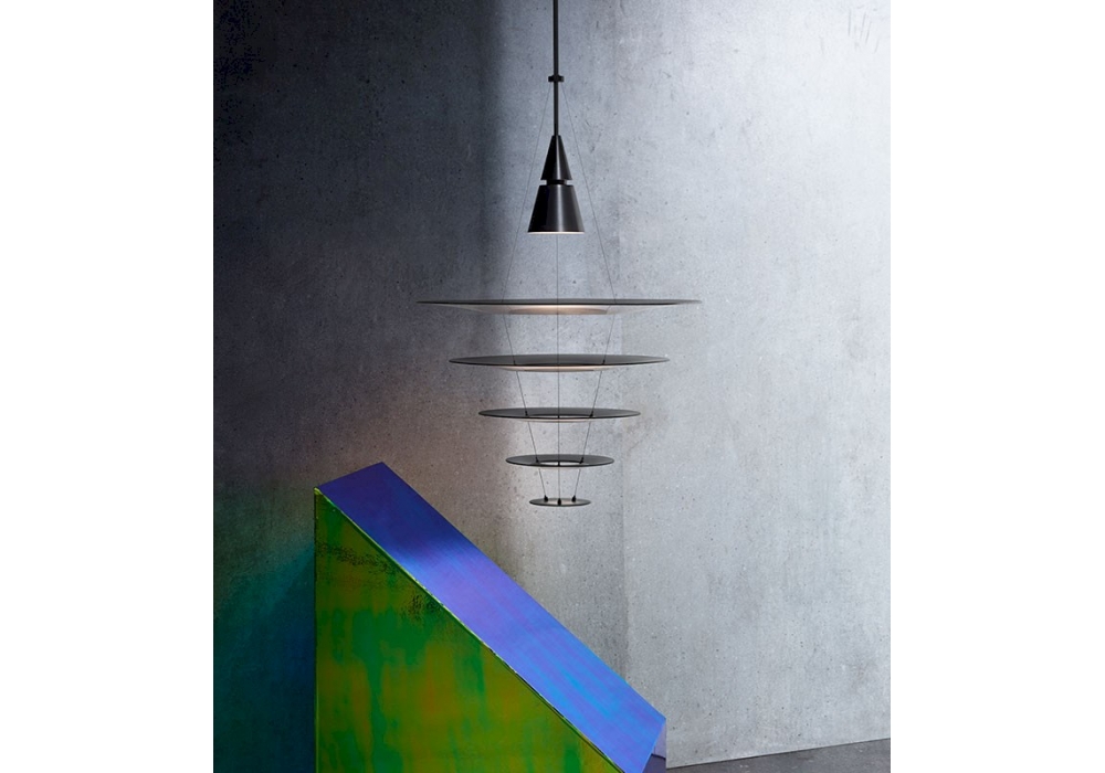 Enigma 545 firmata da Shoichi Uchiyama per Loius Poulsen è una lampada a sospensione con struttura e corpo lampada in alluminio verniciato nero. I schermi riflettenti sono dei cerchi concentrici in acrilico bianco o nero e schermano una sorgente luminosa con innesto GU10 di tipo LED o alogeno. Enigma 545 è disponibile in differenti finiture.