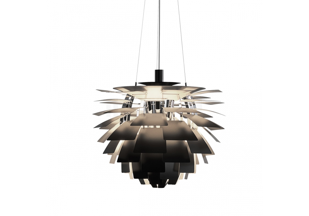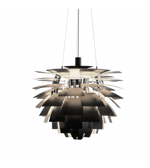 PH Artichoke firmata da Poul Henningsen per Louis Poulsen è una lampada a sospensione con telaio in acciaio cromato con ancorate 72 lamine di metallo tagliate a laser. I diffusori sono due in acciaio tirato verniciato bianco o nero e schermano una sorgente luminosa di tipo LED o alogena in versione dimmerabile o standard. PH Artichoke è disponibile in differenti finiture, dimensioni e versioni.