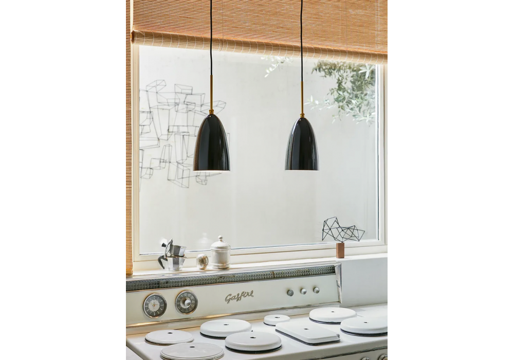 Gräshoppa firmata da Greta M. Grossman per Gubi è una lampada a sospensione con struttura in ottone, diffusore verniciato a polvere disponibile in diverse finiture e cavo elettrico in tessuto. Questa lampada monta il diffusore conico su un giunto di ottone.