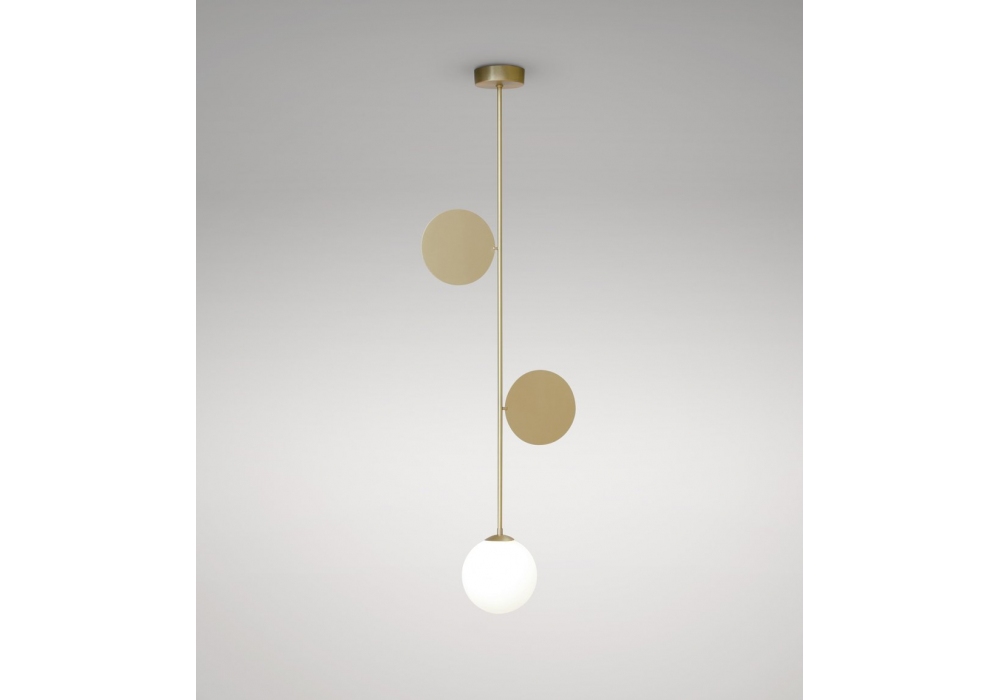 Plates firmata da Atelier Areti è una lampada a sospensione caratterizzata da una struttura in ottone satinato o verniciata. Paralume in vetro a forma di sfera.
