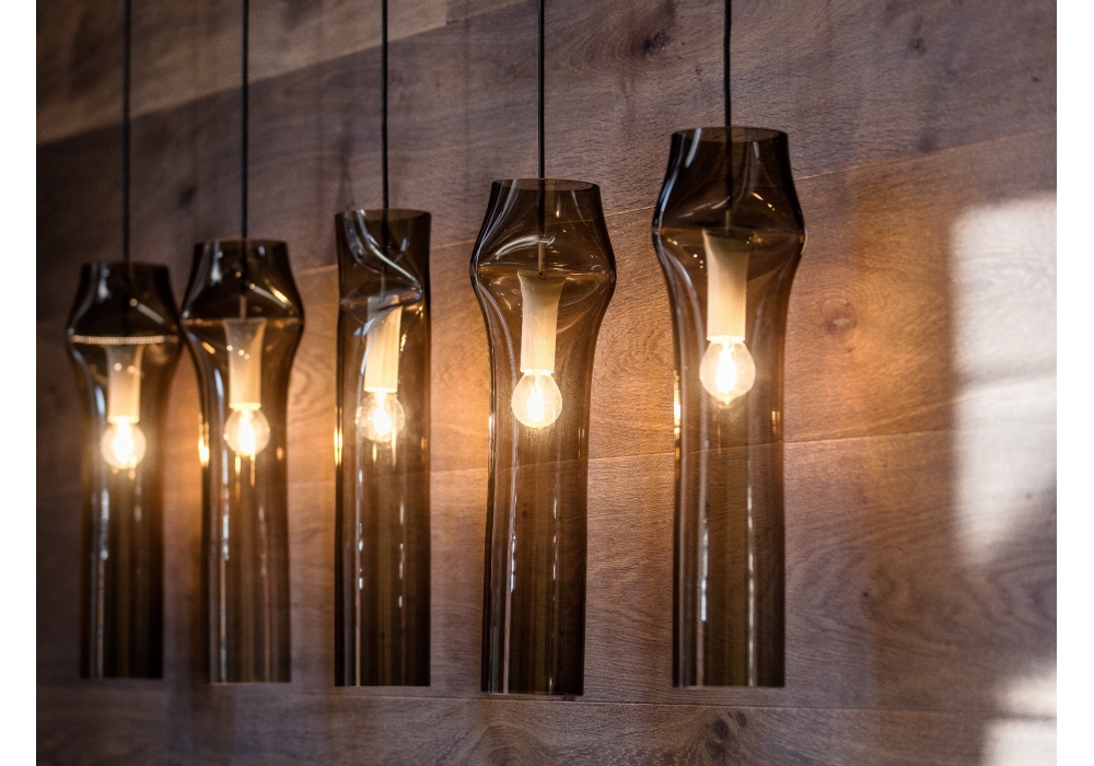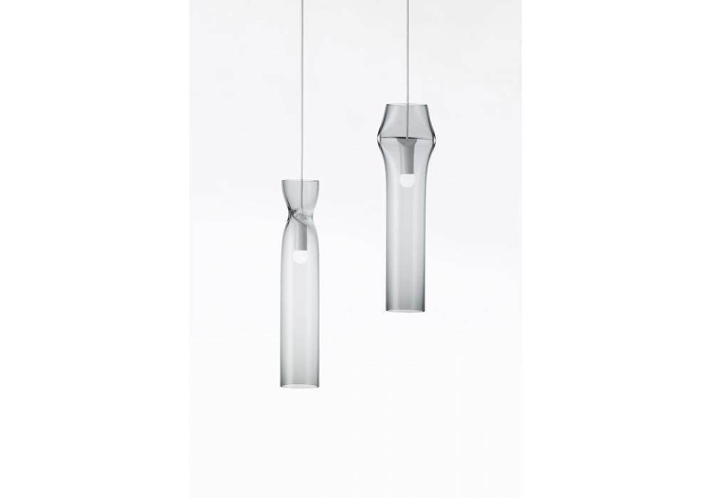 Press Lamp disegnato da Nendo per Lasvit è una lampada a sospensione. Realizzata in vetro soffiato a mano. Non ha nessuna parte in metallo, la sua compressione produce una forma morbida e dona alla lampada un aspetto singolare. Questo prodotto è disponibile in due diverse finiture.