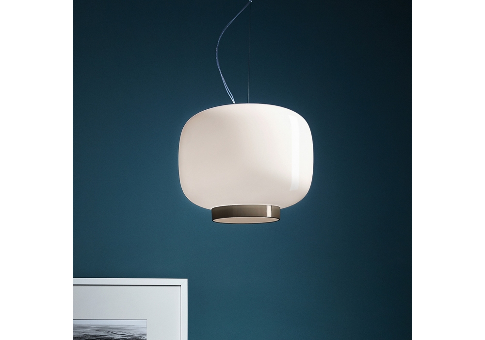Chouchin 3 Reverse firmata da Ionna Vautrin per Foscarini è una lampada a sospensione di forma circolare in vetro soffiato bianco con bordo verniciato color grigio. la sorgente luminosa adottata è con innesto E27 LED disponibile in differenti versioni.