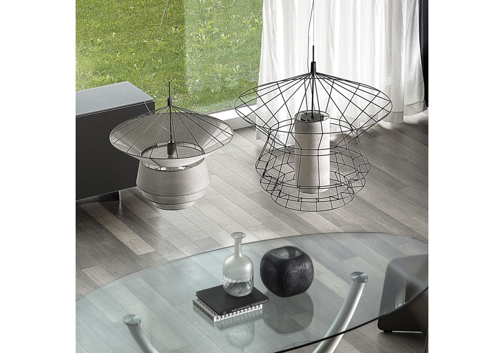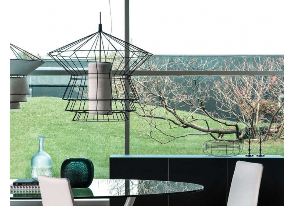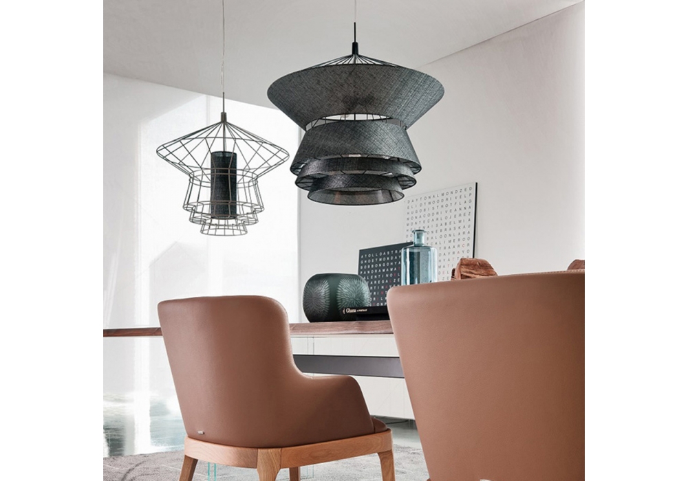 Zeppelin firmata da Oriano Favaretto per Cattelan Italia è una lampada da sospensione con struttura in acciaio verniciato disponibile in due colori: nero o nichel. Diffusore rivestito in tessuto nelle finiture avorio, marrone o nero. Disponibile in due dimensioni e nelle versioni da 220V o 110V. É possibile integrare un cavo aggiuntivo di 2 mt. Lampadina non inclusa.