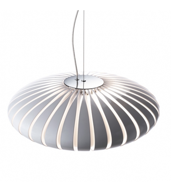 Maranga 50 firmata da Christophe Mathieu per Marset è una lampada a sospensione realizzata in policarbonato bianco e metallo cromato.
