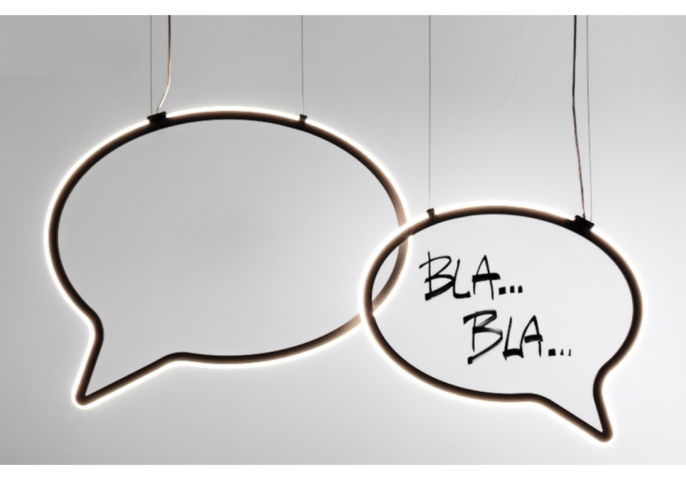 Bla Bla firmata da Emanuele Magini per Mogg è una lampada a sospensione con telaio in PVC nero e luce LED perimetrale. Alimentatore e rosone a soffitto in acciaio cromato. Come optional aggiuntivo è previsto un plexiglas da inserire internamente al telaio per scrivere nel fumetto solo con pennarelli per lavagne bianche (marcatore cancellabile a secco).