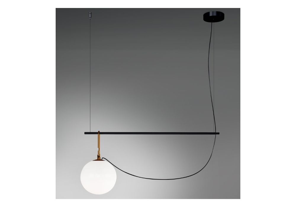 NH S2 22 firmata da Neri&Hu per Artemide è una lampada a sospensione con una barra di sostegno in acciaio e gancio di sostegno in ottone. Il diffusore sferico è in vetro soffiato bianco ed adotta una sorgente luminosa di tipo LED dimmerabile.