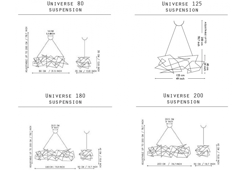 Universe firmata da Jan Pauwels per Quasar è una lampada a sospensione con corpo lampada di forma quadrangolare destrutturata composta da una serie di aste tubolari ancorate l'una all'altra. Le sorgenti luminose fissate alla struttura sono di tipo LED. Cosmos è disponibile in differenti dimensioni, finiture e su richiesta in versione Downlight led.