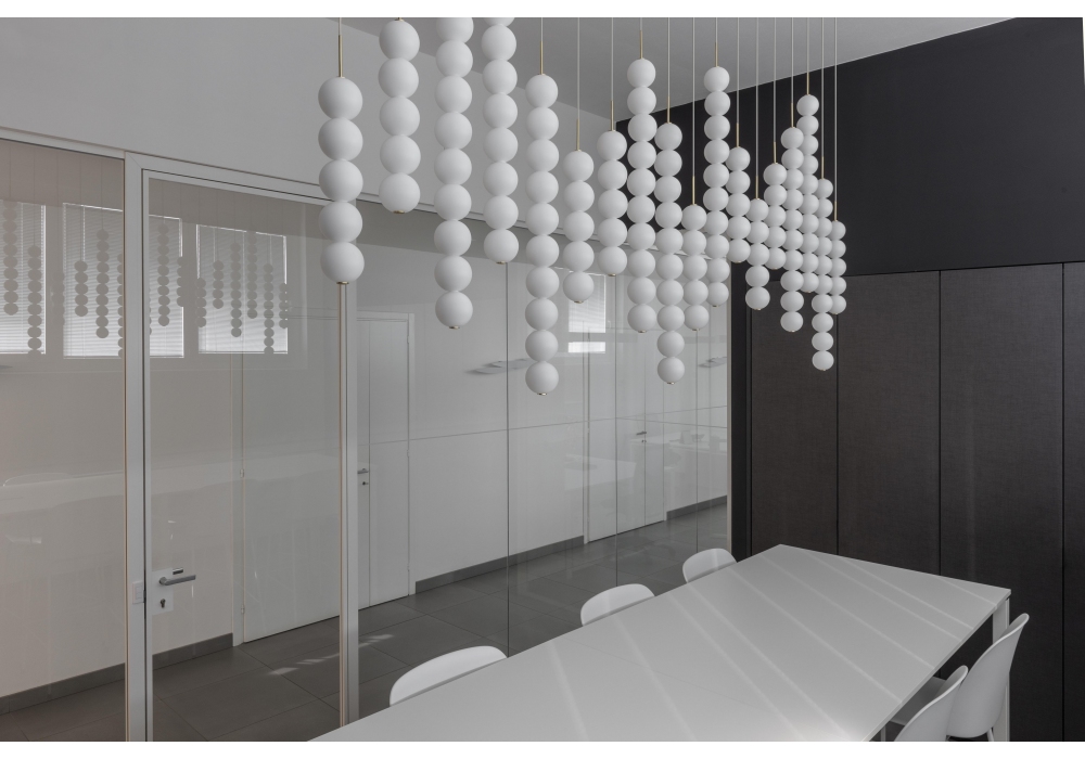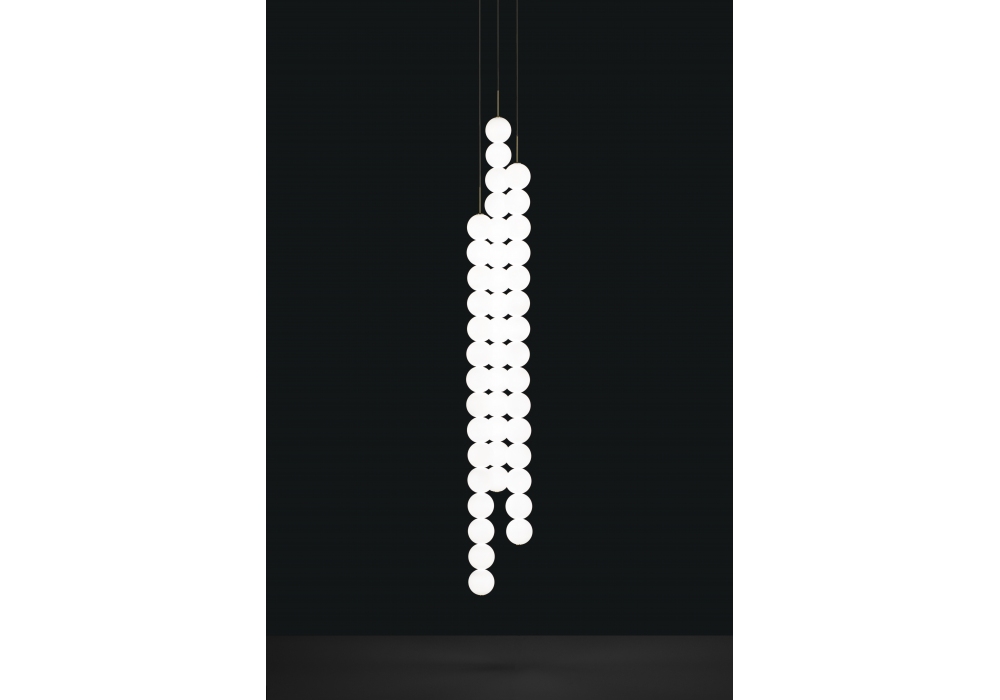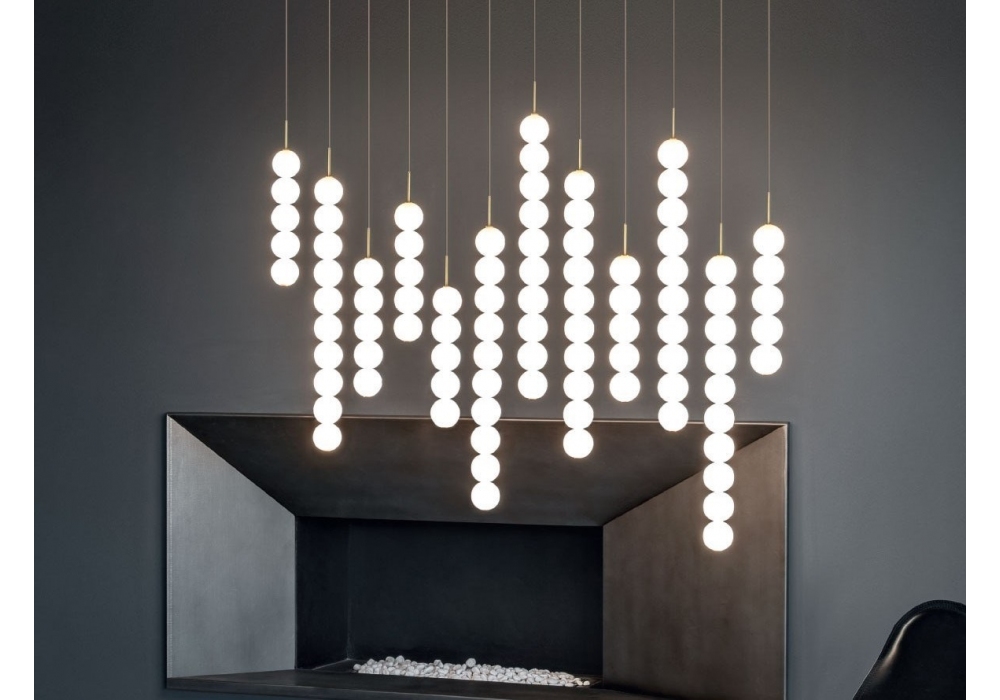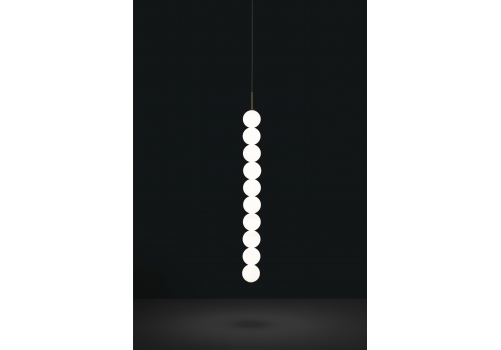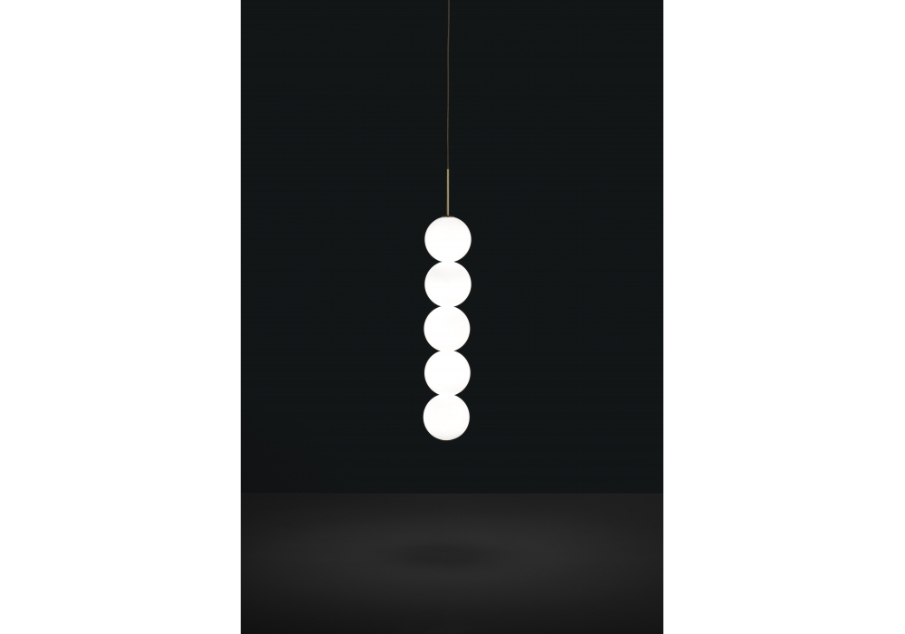 Abacus firmata da Draw per Terzani è una lampada a sospensione con struttura portante in ottone satinato o verniciato bianco. I diffusori sono di forma sferica in vetro soffiato opalino e schermano una sorgente luminosa di tipo LED dimmerabile in differenti versioni. Abacus è disponibile in diversi modelli e finiture.