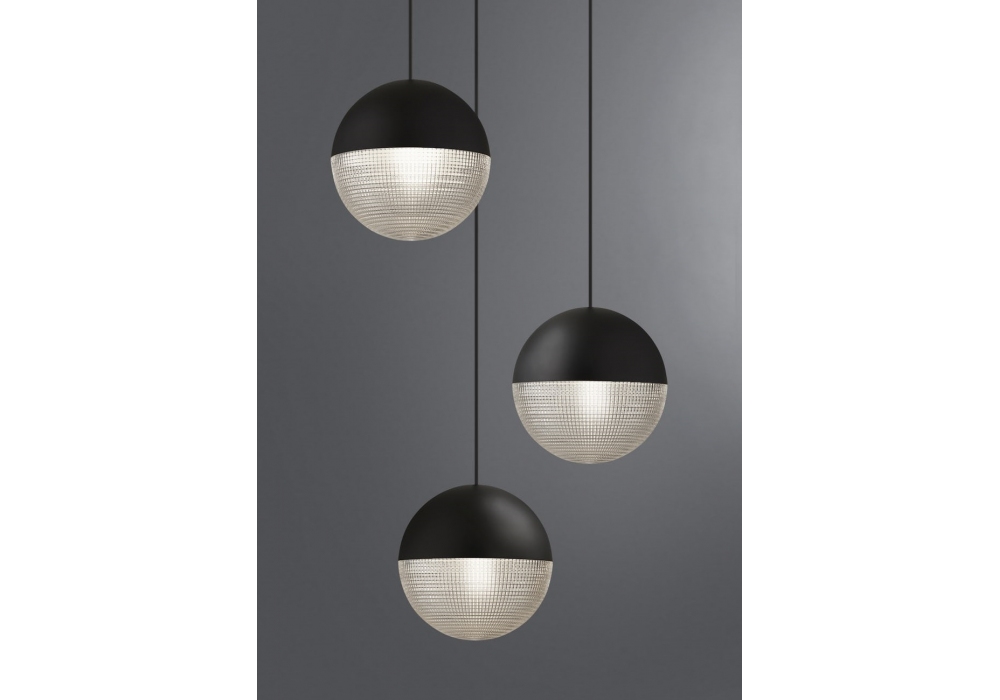 Lens Flair firmata e prodotta da Lee Broom è una lampada a sospensione di forma sferica strutturata in acciaio verniciato e materiale plastico. Il diffusore è in policarbonato trasparente e scherma una sorgente luminosa di tipo LED dimmerabile. Lens Flair è disponibile in differenti finiture.