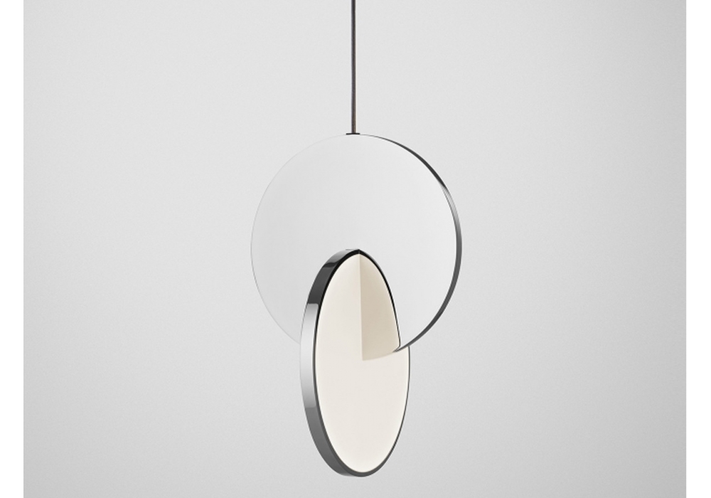 Eclipse prodotta e firmata da Lee Broom è una lampada a sospensione composta da due dischi in cromo lucidato a specchio e diffusore in acrilico color opalino. La sorgente luminosa adottata è di tipo LED dimmerabile.