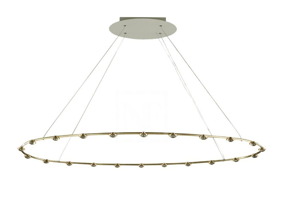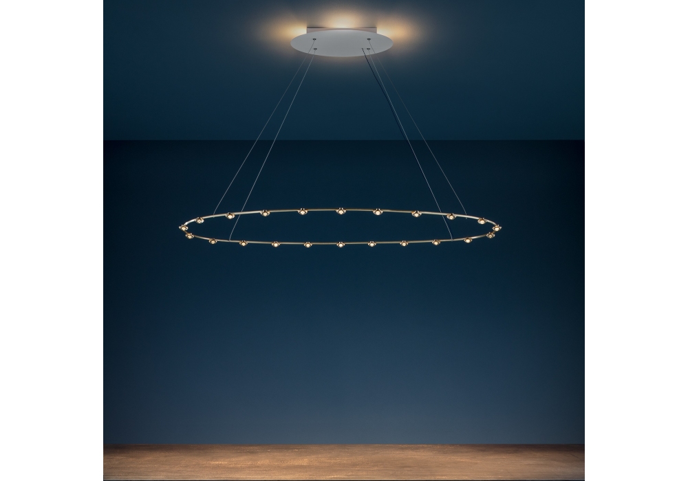 Petites Lentilles firmata da Enzo Catellani per Catellani & Smith è una lampada a sospensione a LED dimmerabile wireless, con base bianca, struttura ovale in ottone non trattato e lenti trasparenti con supporto in ottone.