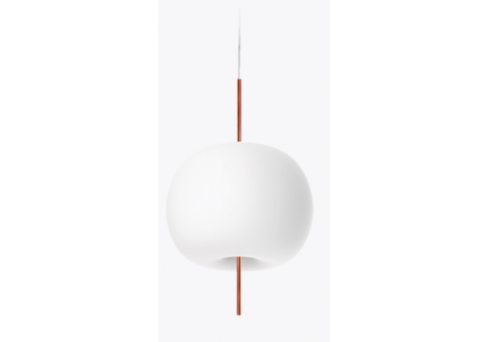 Kushi XL firmata da Alberto Saggia & Valerio Sommella per Kundalini è una lampada a sospensione con diffusore in vetro opale incamiciato e soffiato e struttura in metallo verniciato nelle finiture: nero, rame e ottone.