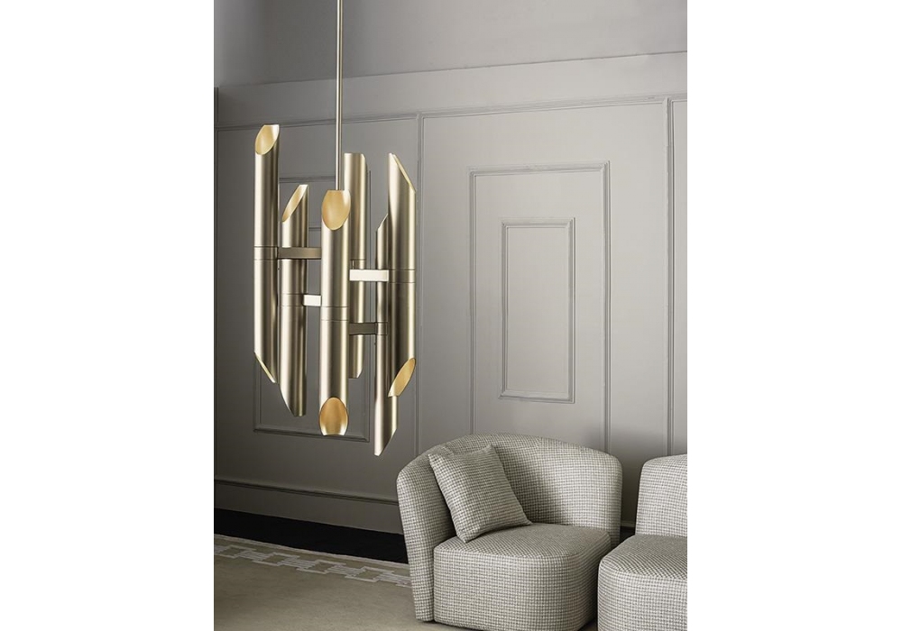 Shard/RDX firmata da Massimiliano Raggi per Casamilano è una lampada a sospensione in metallo verniciato in finitura ottone. É sostenuta da un cavo in acciaio regolabile in altezza.