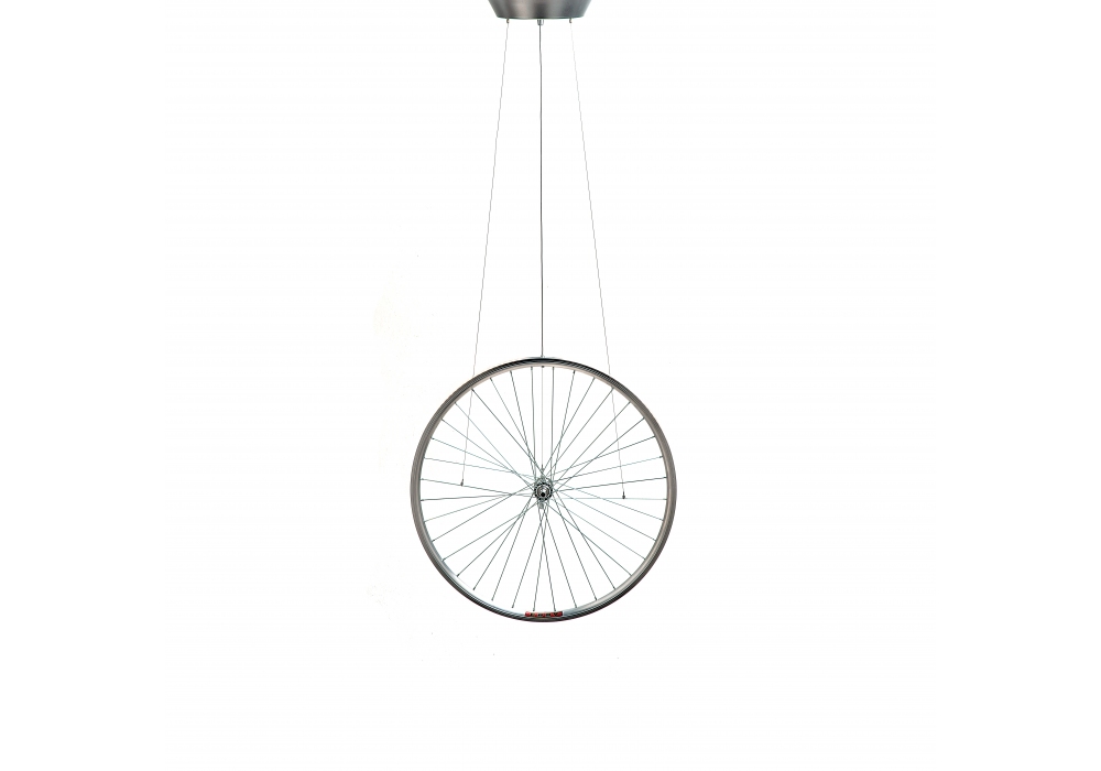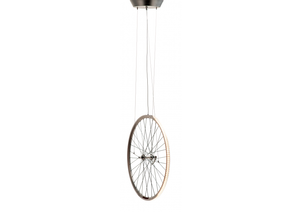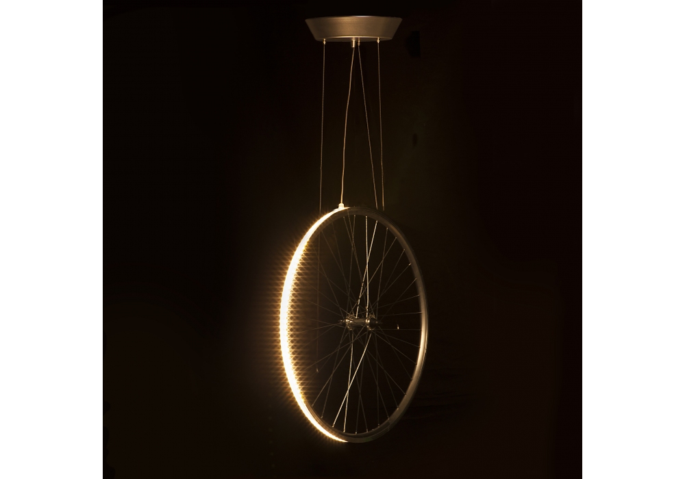 Eddy firmata da Fabio Antinori per Cyclampa è una lampada a sospensione in alluminio. La lampada è composta da una ruota della biciletta originale in alluminio pressofuso. Ledstrip ad alta capacità, dotato di chip di controllo termico integrato. Fissaggio a soffitto con 3 cavi in acciaio, regolabili in altezza, ancorati a un perno in alluminio verniciato, driver Ledstrip a bordo.