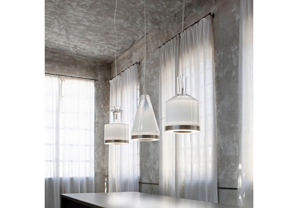 Medea Sp1 firmata da Oriano Favaretto per Vistosi è una lampada a sospensione con struttura in acciaio satinato. Il diffusore è di forma cilindrica in vetro e scherma una sorgente luminosa di tipo LED dimmerabile in differenti gradazioni di luce. Medea Sp1 è disponibile in differenti finiture.