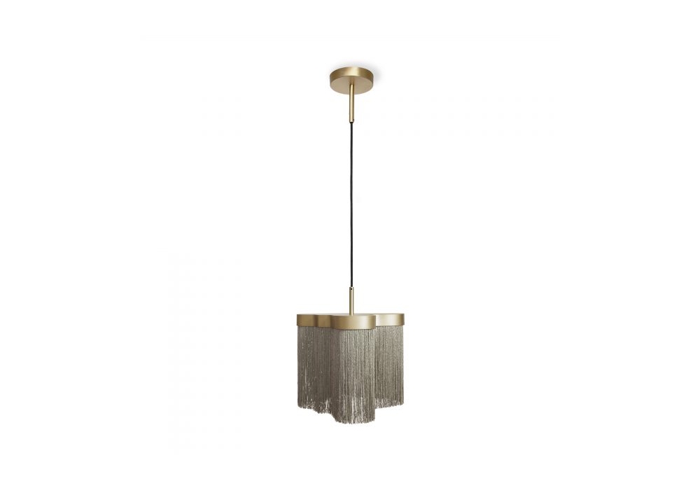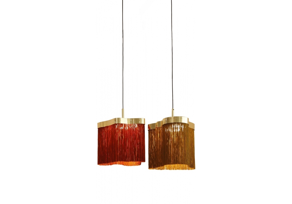 Arcipelago firmata da Servomuto per Contardi è una lampada sospensione con struttura portante e rosone circolare in ottone lucido. Il paralume è in tessuto costituito da frange e scherma una sorgente luminosa di tipo LED con sistema di dimmerabilità o standard. Arcipelago è disponibile in differenti finiture di frange, lunghezza variabile del cavo di sospensione e versioni di controllo della luce.