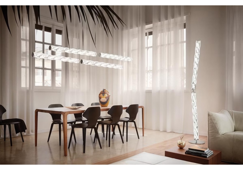 Hugo firmata da Slamp Creative Department per Slamp è una lampada a sospensione strutturata interamente in Lentiflex. Disponibile in due modelli.