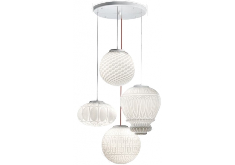 Arabesque 6987/4 firmata e prodotta da MMLampadari è una lampada a sospensione composta da quattro diffusori in vetro soffiato, con montatura in metallo, disponibile in diverse varianti di colore.