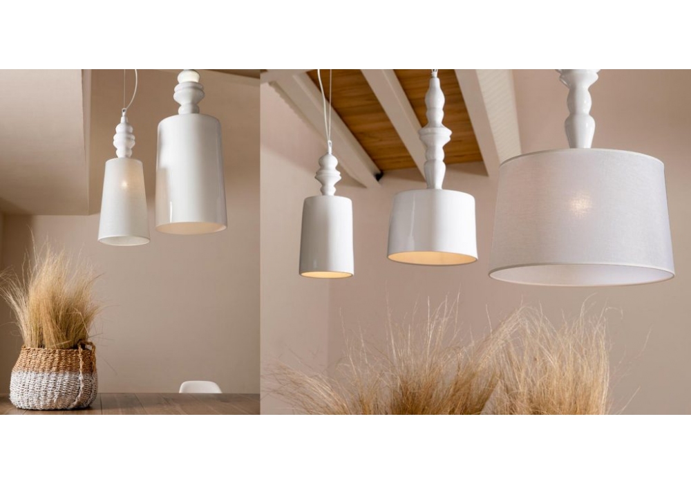 Alì e Babà firmata da Matteo Ugolini per Karman è una lampada a sospensione con corpo lampada in ceramica bianco lucido, attacco a soffitto in metallo bianco lucido e paralume circolare disponibile in ceramica bianco lucido o in lino bianco. Diversi modelli disponibili.